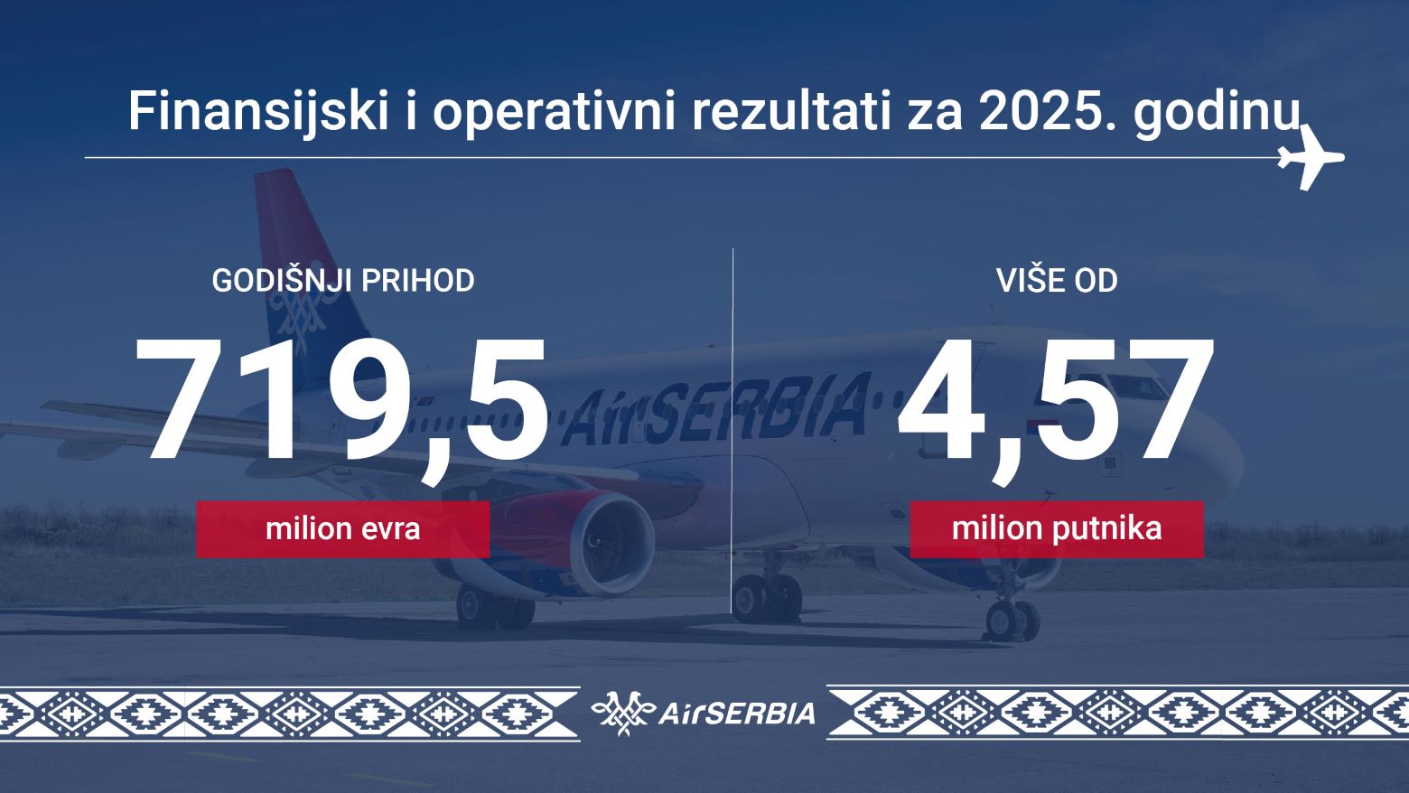 Nacionalna avio-kompanija je u 2025. godini zabeležila stabilne poslovne rezultate, uz rast potražnje, povećanje broja putnika i dalji razvoj mreže destinacija. Finansijski izveštaji pokazuju da su ukupni prihodi kompanije iznosili 719,5 miliona evra, čime je Er Srbija drugu godinu zaredom premašila prihod od 700 miliona evra, saopštila je kompanija Er Srbija.