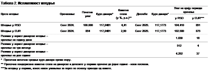 Naime, ukoliko bi štediša oročio iznos od 100.000 dinara u septembru 2024. godine u dinarima, na kraju perioda oročenja (u septembru 2025. godine) dobio bi preko 1.800 dinara (16 evra) više od štediše koji bi u istom periodu oročio evre u protivvrednosti 100.000 dinara (Tabela 2).