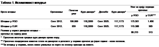 Oročavanjem štednje od septembra 2012. na godinu dana i njenim reoročavanjem u periodu od trinaest godina, štediša bi na ulog od 100.000 dinara na kraju perioda oročenja, u septembru 2025. godine, dobio preko 60.000 dinara (preko 500 evra) više od štediše koji bi u tom periodu na štednju u evrima položio protivvrednost istog iznosa (Tabela 1).