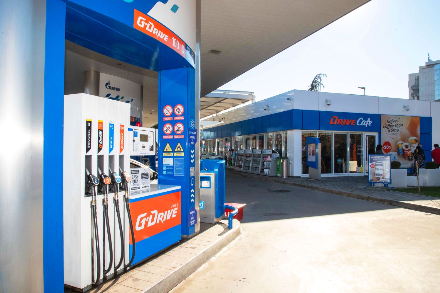 Pored vrhunskog kvaliteta goriva domaće proizvodnje koje se proizvodi u Rafineriji nafte Pančevo, NIS Petrol i Gasprom benzinske stanice nude bogat izbor robe široke potrošnje kao i visok nivo usluga. Između ostalog, u okviru najveće maloprodajne mreže na domaćem tržištu naftnih derivata, na oko 330 benzinskih stanica širom Srbije, dostupni su ekskluzivni proizvodi od kojih se mnogi već godinama razvijaju pod brendovima G-Drive i Drive Café.