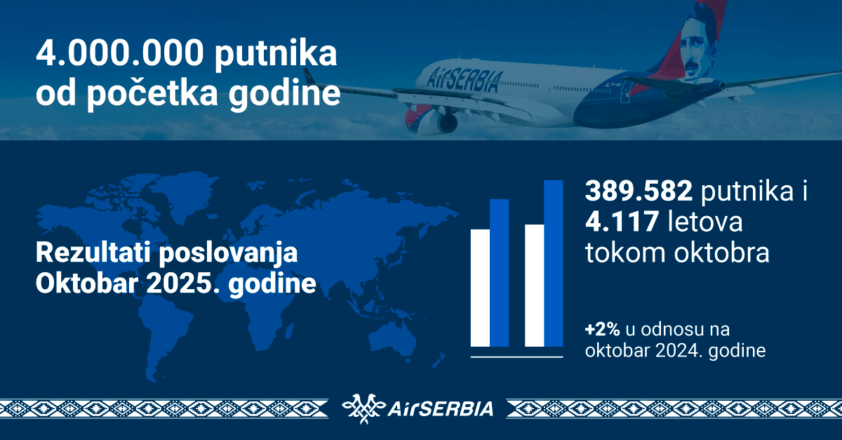 Rekordni oktobar 2025. godine bio je doprinos ovom značajnom rezultatu. U tom mesecu, Er Srbija je prevezla 389.582 putnika i realizovala 4.117 letova, što je povećanje od 2 odsto u odnosu na isti mesec prošle godine.