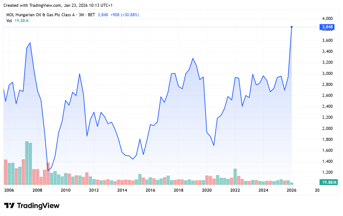 Jer, jutros se pokazalo da su akcije naftne kompanije MOL porasle za više od 32 procenta u 2026. godini, konstatovao je Portfolio.